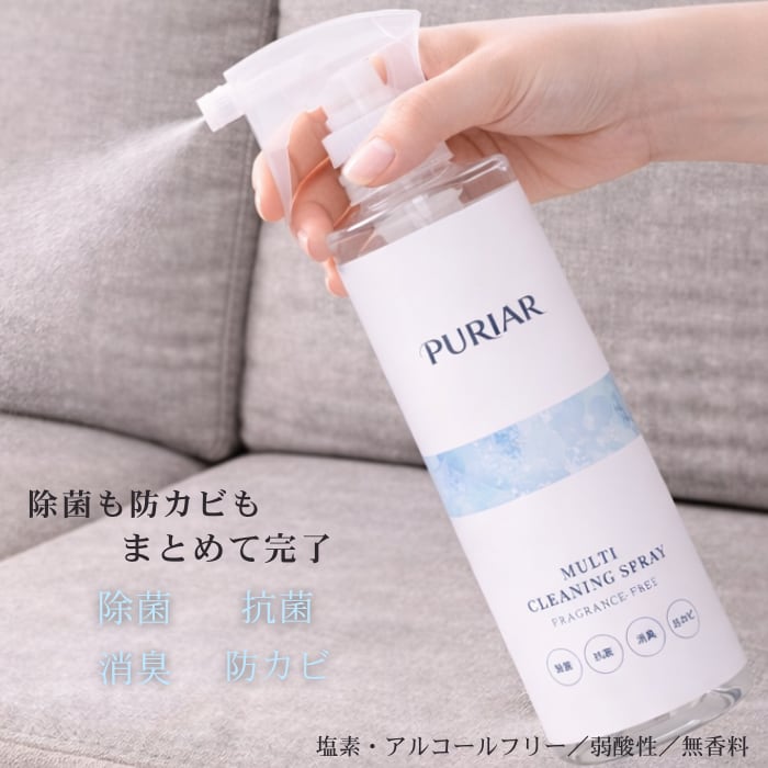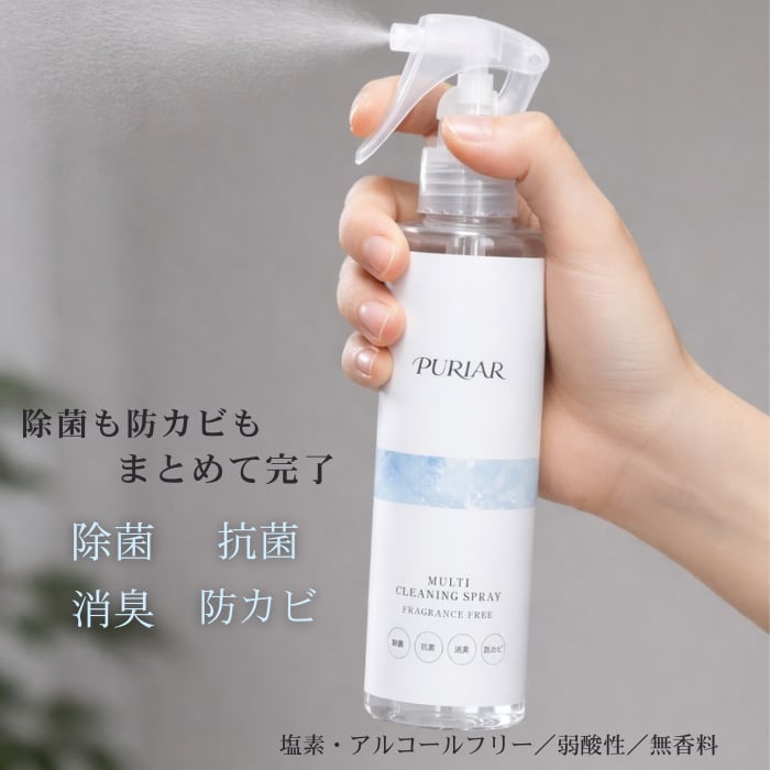 PURIAR(プリア)は、除菌・消臭の即効性と、抗菌・防カビの持続力が期待できる多機能衛生スプレーです。