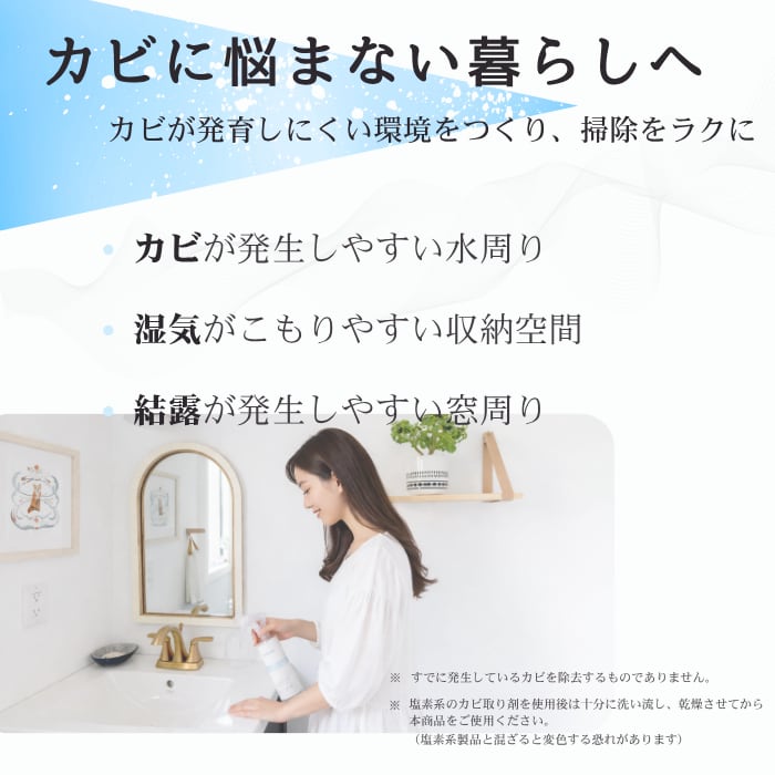 ・本製品はカビ除去剤ではありません。すでにカビが発生している場合は、きれいに清掃してからご使用ください。
