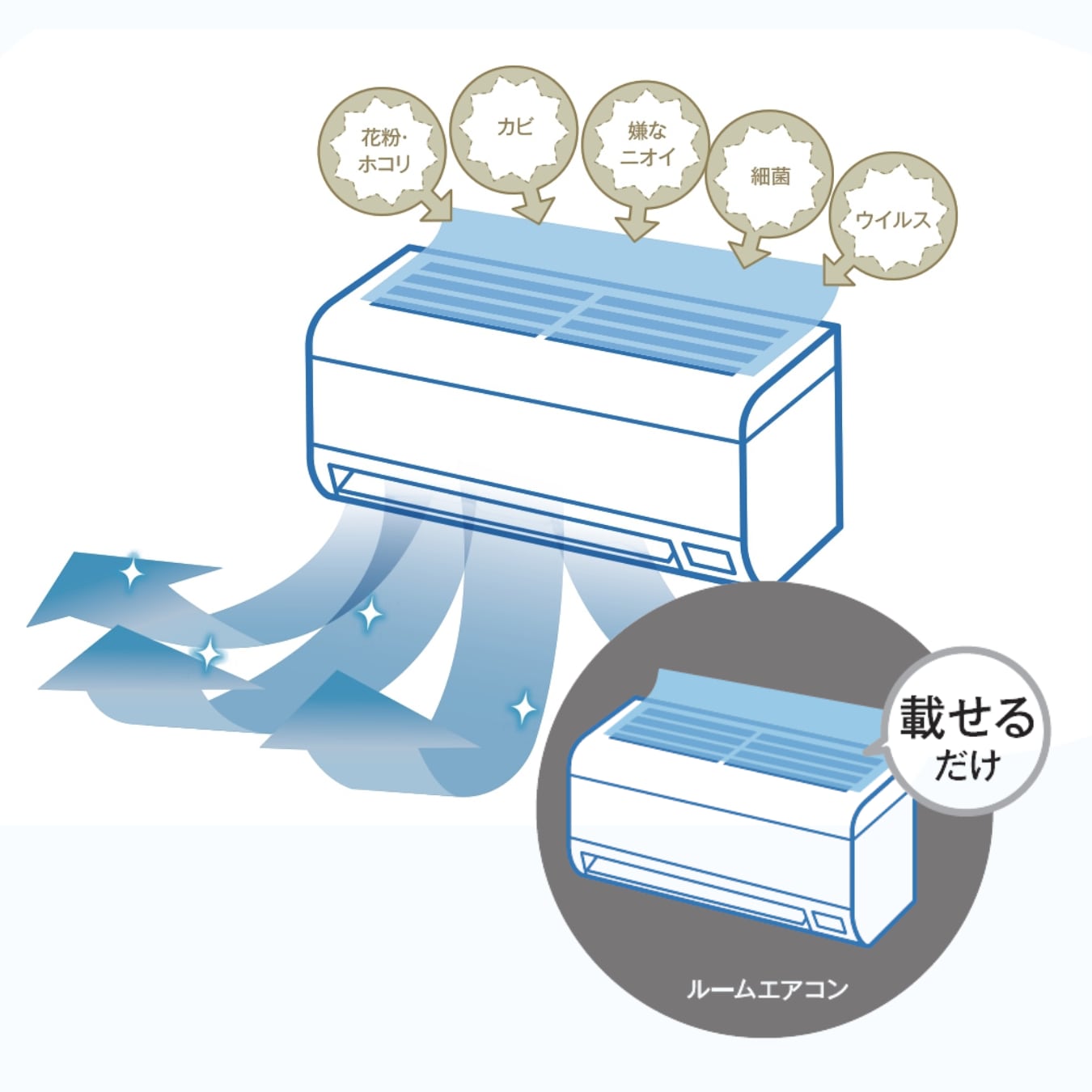 今お使いのルームエアコンに、空気清浄機能を手軽にプラスできるフィルターです。